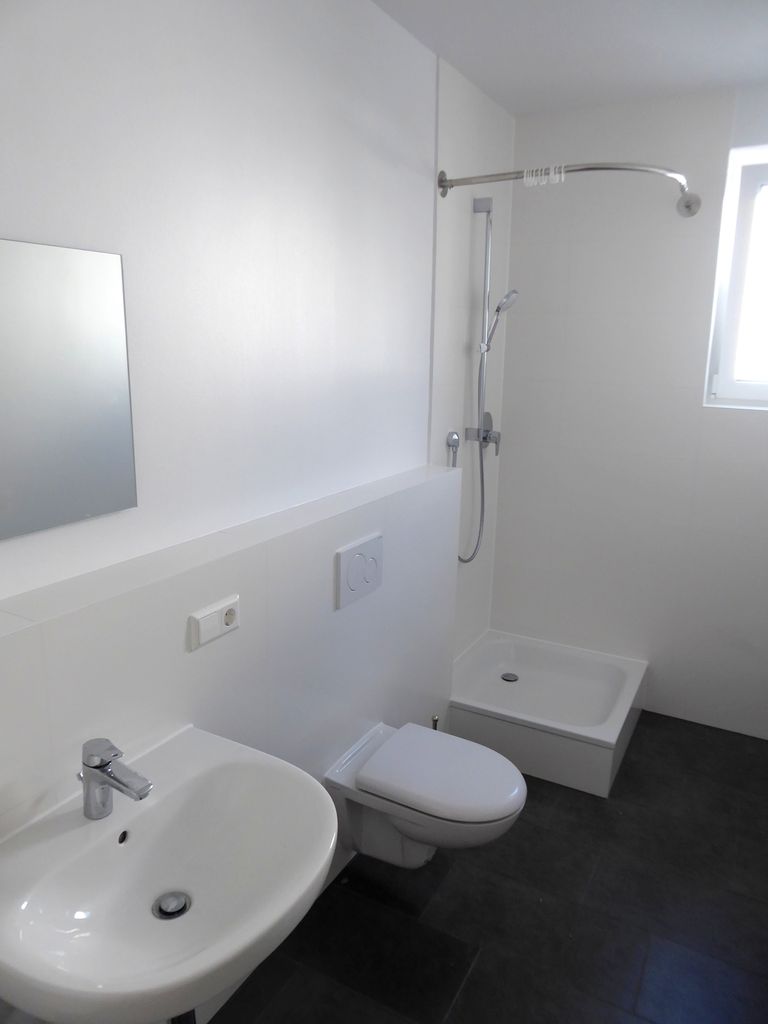 OG: Schlafzimmer, Kinderzimmer, Bad mit Dusche und WC, Flur, Balkon